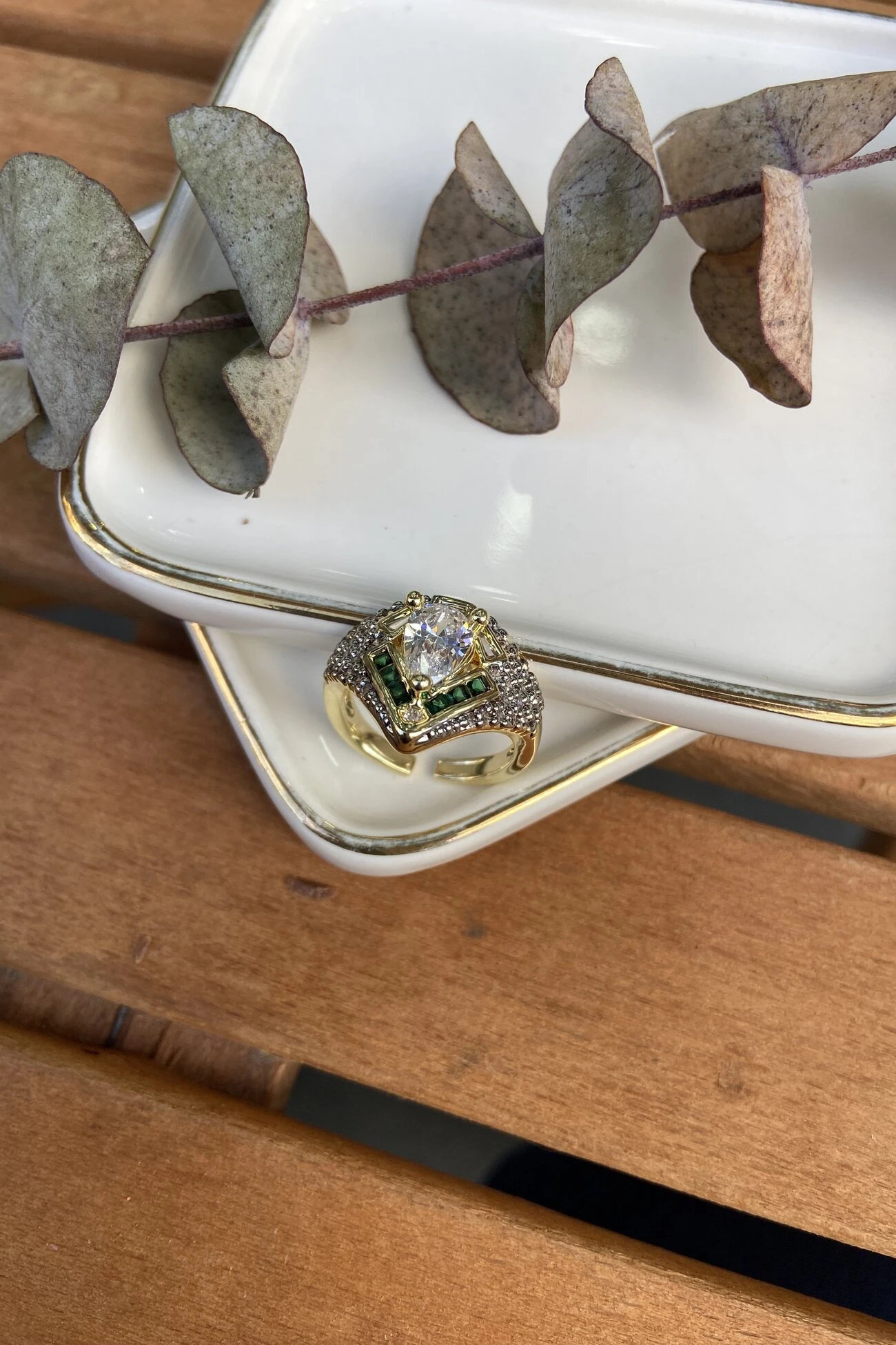 14K Altın Kaplama Yeşil Taşlı Flama Yüzük